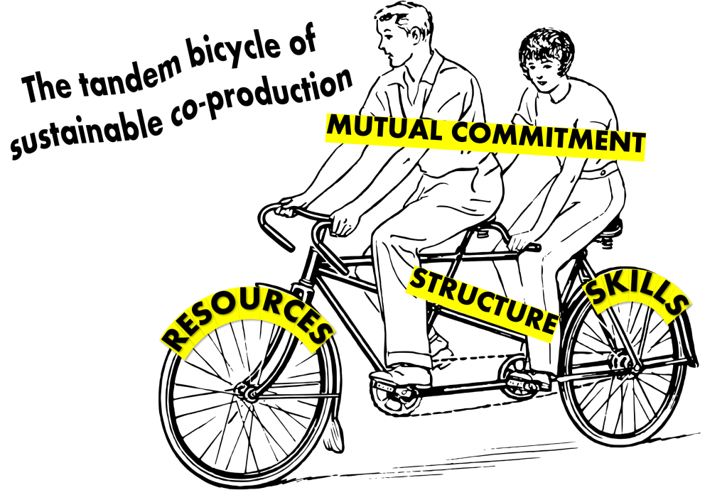 These four elements come together into what I call ‘The tandem bicycle of sustainable co-production’. In this model, resources and skills each represent a wheel of the bicycle, while structure represents the bicycle’s frame. Mutual commitment is represented by two riders (citizens and professionals) on the bike. The bike frame (structure) creates the possibility for forward movement, but only if the wheels fit and there is air in the tires (resources and skills). Yet the tandem bike does not move unless both riders are pedalling. Some bike frames are larger than others, in which case they require larger wheels (perhaps even mountain bike tyres), but regardless of the type of bike, the two riders acting together are the only way to get from point A to point B. If the riders are uncomfortable on the bike, they may choose to stop riding. Conversely, if they are particularly enthusiastic, they may be able to ride the bike a long way, even if it is not an excellent bicycle. Riders must also be willing to periodically swap places so that their efforts are shared equally, and for longer rides, it may be necessary to find new riders so that they can continue to pedal.